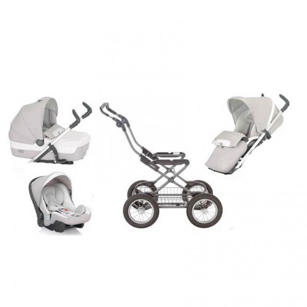 Большие колеса обеспечивают непревзойденную плавность хода коляски, шасси выполненное в стиле ретро с хромированными элементами отлично смотрится с классическим дизайном люльки. Еще одним достоинством шасси является запатентованная компанией Inglesina зонтичная система сложения одной рукой. Все элементы обивки съемные и подлежат ручной стирке. В комплектацию входит: люлька, шасси, прогулочный блок, подставка для люльки, сумка с пеленальным столиком для мамы, теплая накидка на ножки, дождевик.