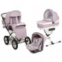 Большие колеса обеспечивают непревзойденную плавность хода коляски, шасси выполненное в стиле ретро с хромированными элементами отлично смотрится с классическим дизайном люльки. Еще одним достоинством шасси является запатентованная компанией Inglesina зонтичная система сложения одной рукой. Все элементы обивки съемные и подлежат ручной стирке. В комплектацию входит: люлька, шасси, прогулочный блок, подставка для люльки, сумка с пеленальным столиком для мамы, теплая накидка на ножки, дождевик.