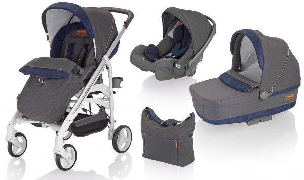Inglesina Trilogy System Jeans – модульная коляска 3 в 1, обеспечивающая максимальную практичность и комфорт. Итальянское качество в этой модели сочетается с функциональностью. Вся коляска буквально напичкана достоинствами – запатентованная Инглезиной система сложения коляски одной рукой (зонтик), поворотные передние колеса, многофункциональное шасси, большой капюшон с защитой от ультрафиолета UF 50+, большой и теплый чехол для ножек малыша, корзина для покупок, сумка для мамы.